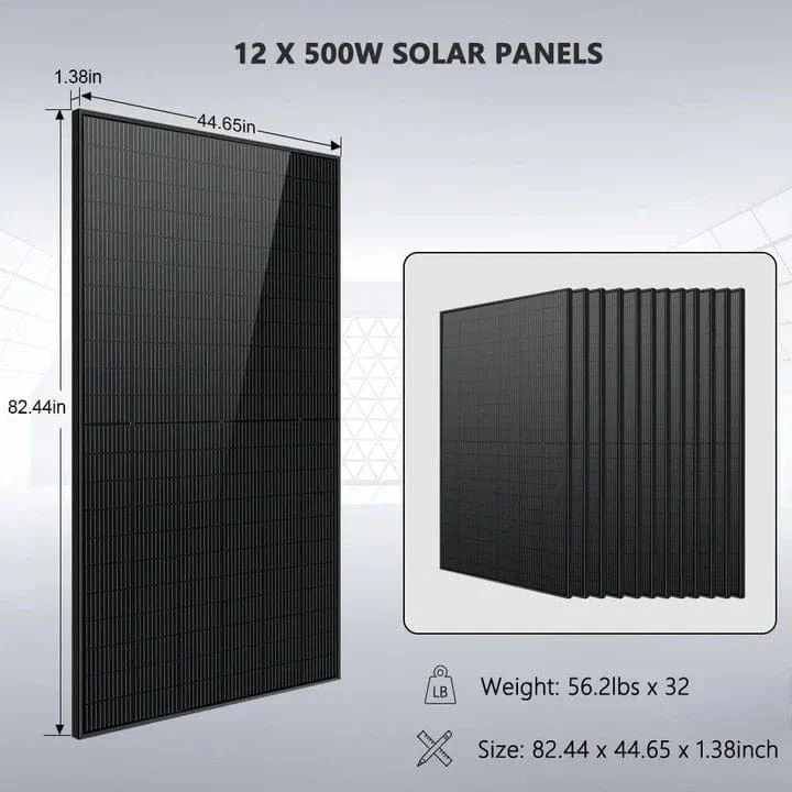 Specifications at a Glance Inverter Power: 7,600W continuous / 15,200W surge Battery Capacity: 15.36kWh (3 × 51.2V 100Ah) Solar Input: 12,000W max Panels: 500W × 12 (Vmp 41.2V, Voc 49.5V) Dimensions (approx): Inverter 20.5 × 14.6 × 5.9 in | Batteries 19.3 × 17.1 × 3.5 in each | Panels 74.4 × 41.1 × 1.4 in each Weight: Inverter 48 lbs | Batteries 105 lbs each | Panels 48.5 lbs each Warranty: 3 years inverter | 10 years batteries | 25 years panels (power output)