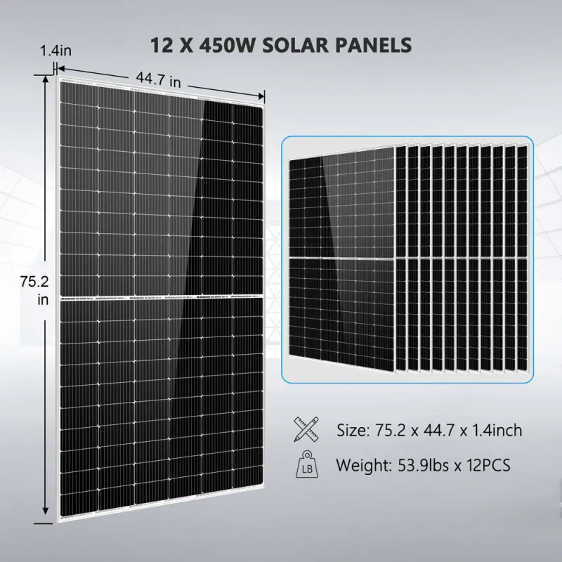 Specifications at a Glance Inverter Power: 8,000W continuous / 16,000W surge Battery Capacity: 10.24kWh (4 × 12.8V 200Ah) Solar Input: 11,000W max Panels: 450W × 12 (Vmp 34.2V, Voc 41.72V) Dimensions (approx): Inverter 25.6 × 17.7 × 5.1 in | Batteries 19.7 × 9.4 × 9.1 in each | Panels 75.2 × 44.7 × 1.4 in each Weight: Inverter 53.5 lbs | Batteries 48.5 lbs each | Panels 53.9 lbs each Warranty: 3 years inverter | 5 years batteries | 25 years panels (power output)