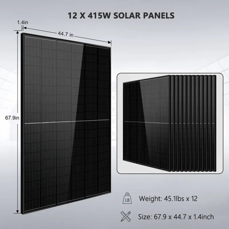 Specifications at a Glance Inverter Voltage: 48VDC input, 120/240V AC output • Continuous Power: 8000W • Surge Power: 16,000W • MPPT Solar Input: 11,000W max (120–500V) • Battery: 51.2V 100Ah x4 (20.48kWh total) • Continuous Discharge: 100A per battery • Max Charge Current: 100A per battery • Solar Panels: 415W monocrystalline x12 • VMP: 31.61V • VOC: 38.82V • Efficiency: 22.2% • Efficiency: >95% overall • Dimensions: Inverter 25.6 × 17.7 × 5.1 in • Batteries 19.3 × 18.9 × 5.5 in each • Panels 67.9 × 44.7 × 1.4 in each • Weight: Inverter 53.5 lbs • Batteries 93 lbs each • Panels 45.1 lbs each • Certifications: UL1741 (inverter), UL61730 (panels), UN38.3 (batteries) • Warranty: 3 years inverter, 10 years batteries, 25 years panels