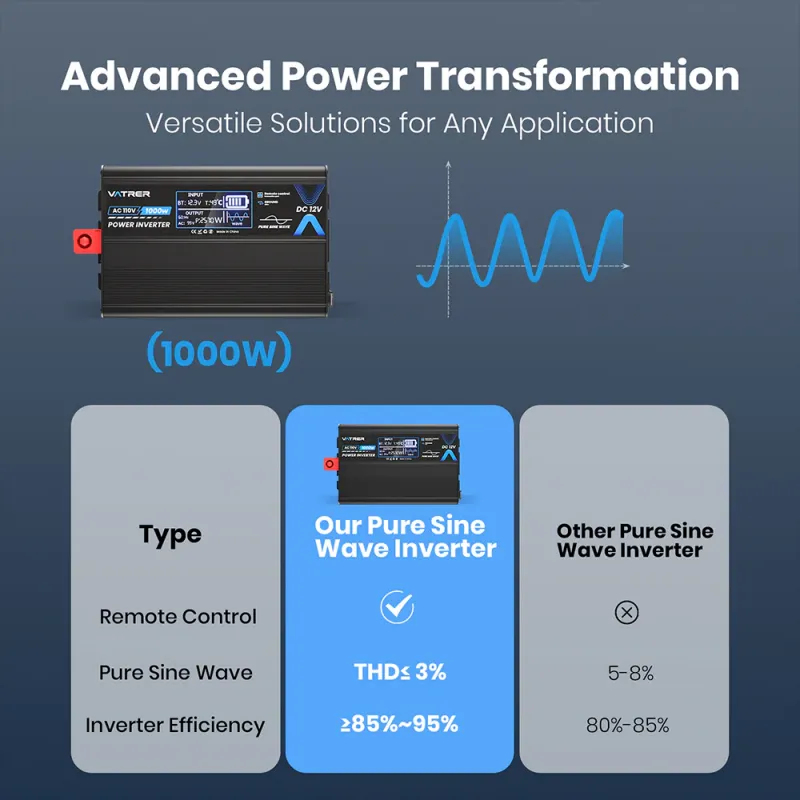 Get perfect household AC power from your 12V battery with the Vatrer 1000W Pure Sine Wave Inverter (Model: 1000W Pure Sine Wave Inverter 12V to 120V). Delivering 1000W continuous (2000W surge) with ultra-clean output (THD <3%), it safely runs laptops, TVs, CPAP machines, small fridges, lights, and sensitive electronics. Compact, quiet, and packed with protection — the ideal everyday inverter for van life, weekend camping, marine use, and emergency backup.