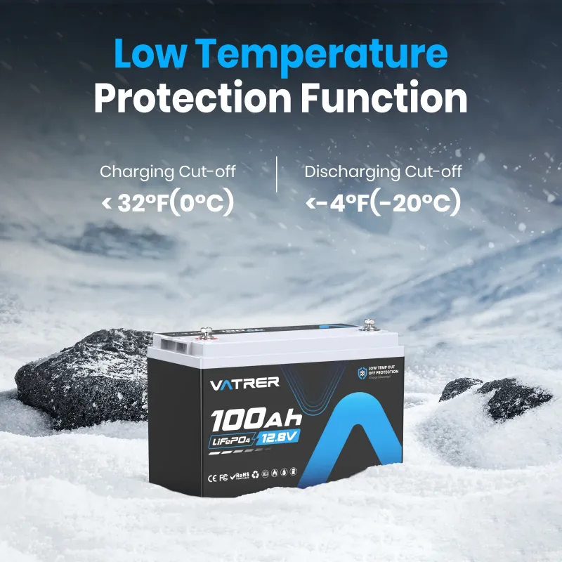 Vatrer 12V 100Ah Low Temp Deep Cycle Group 31 LiFePO4 Lithium Battery – Cold-Weather Protection for Marine, RV, Solar & Off-Grid