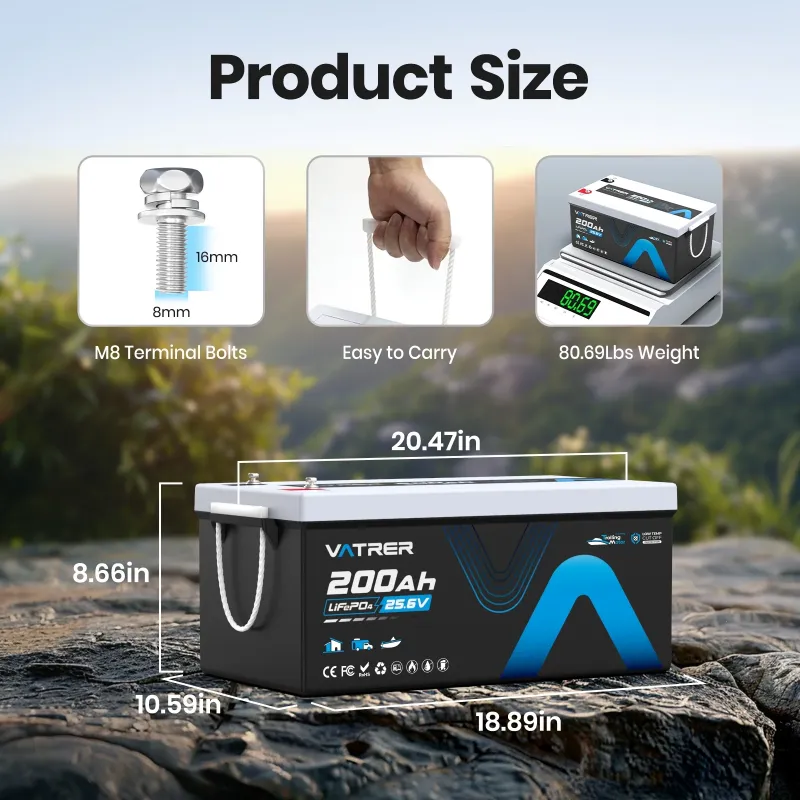 Specifications at a Glance Nominal Voltage: 12.8V • Capacity: 200Ah • Energy: 2560Wh • Continuous Discharge: 200A • Peak Discharge: 400A (10s) • Max Charge Current: 200A • Efficiency: >99% • Self-Discharge: <3% per month • Dimensions: 16.5 × 9.4 × 8.7 in • Weight: 48.5 lbs • Terminals: M8 × 1.25 • Enclosure: IP67 SPCC steel • Certifications: UL1973 (cells), UN38.3, FCC, CE, RoHS