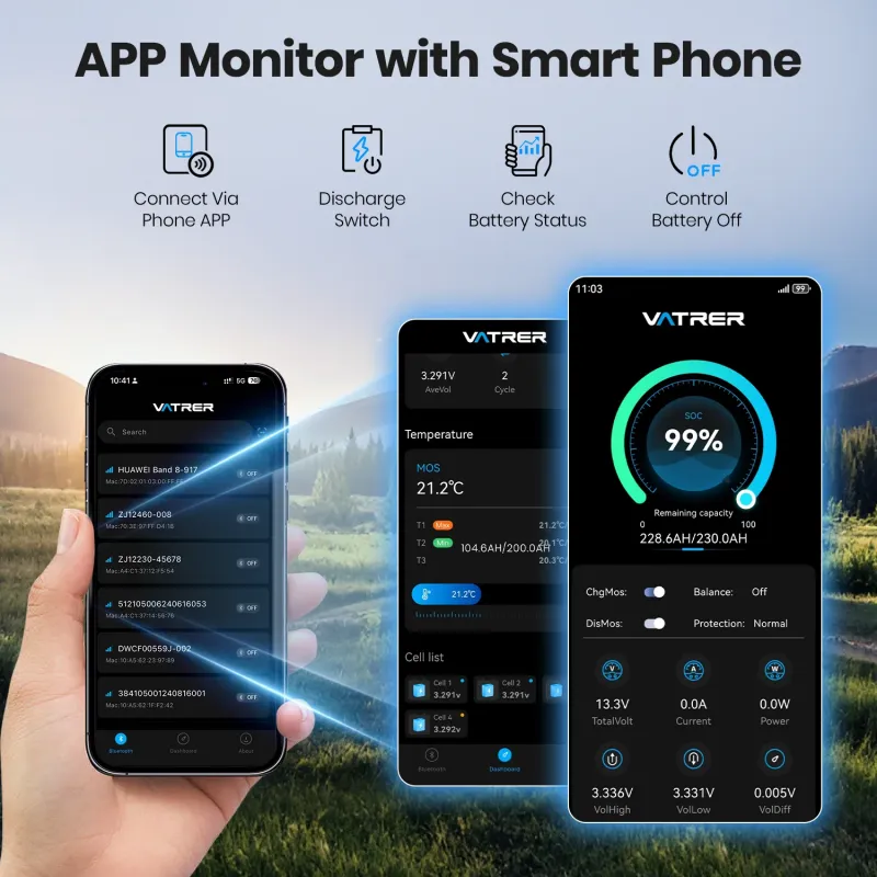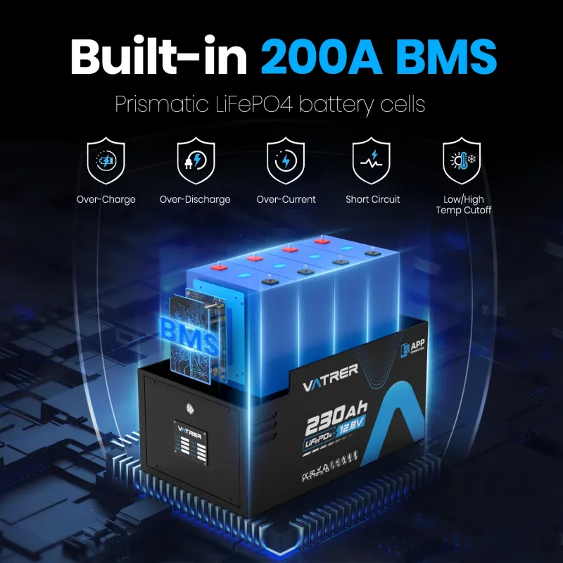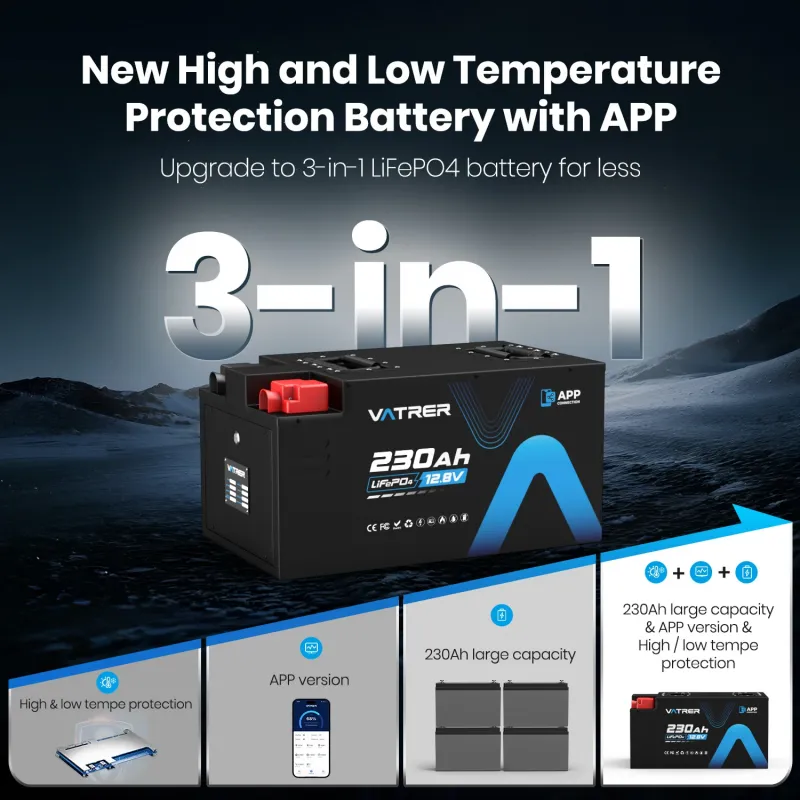 Product Description for Vatrer 12V 230AH 200A BMS Low Temp Cutoff LiFePO4 RV Battery Bluetooth Version
