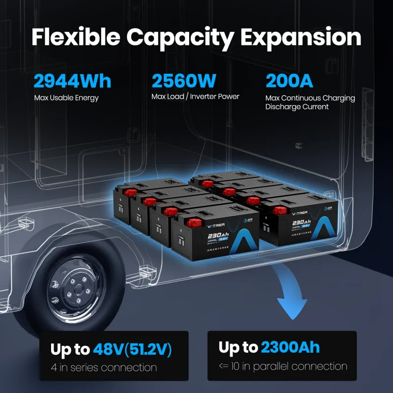 Key Features Low-Temp Charge Cutoff – safely stops charging below 32°F (0°C) to prevent damage (discharge works to -4°F). 200A Continuous / 400A Peak BMS – supports up to 2560W loads for high-draw inverters and appliances. Bluetooth 5.0 Real-Time Monitoring – SOC, voltage, current, temperature, and health via app. 2944Wh Usable Capacity – run a full RV or marine system for days. Only 58 lbs – lighter than two standard 100Ah lead-acid batteries. 6000+ Cycles at 80% DOD with automotive-grade prismatic cells. IP67 Waterproof & Dustproof SPCC steel case built for extreme environments. Fully Scalable – up to 4S4P (47kWh total) and drop-in compatible. Safe & Certified – UL-listed cells, 5-year warranty.
