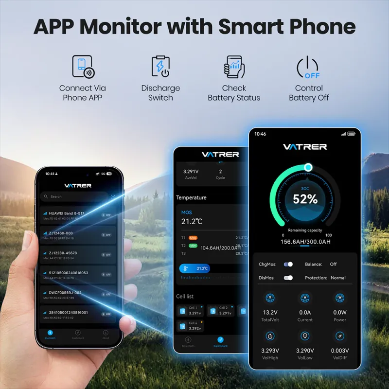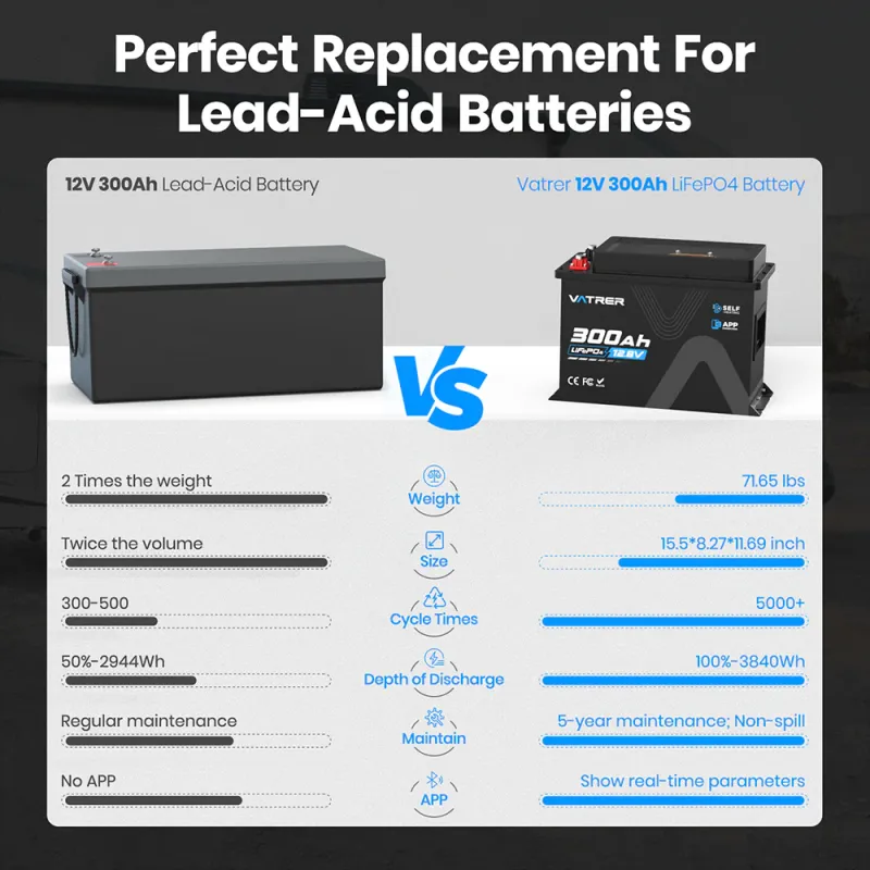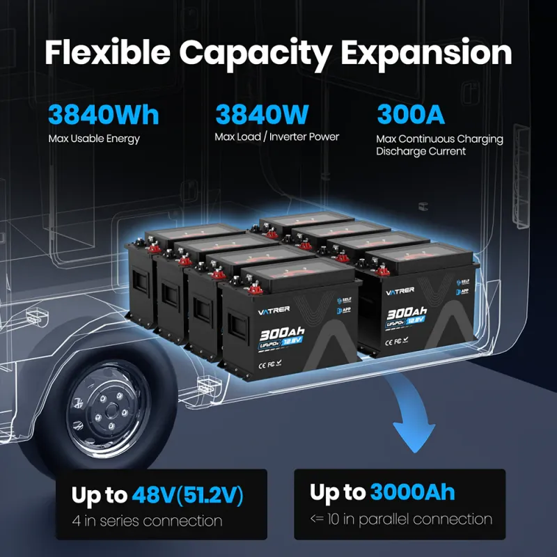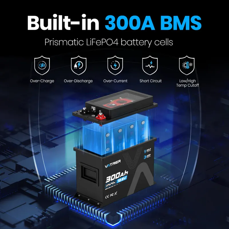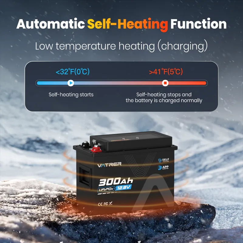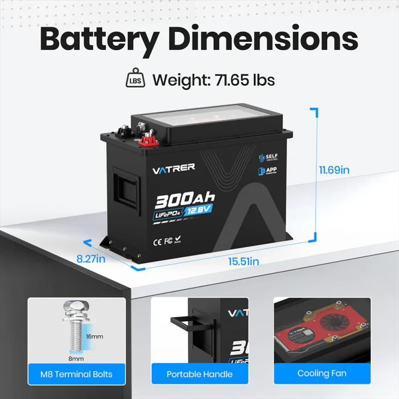 Pre-order the next evolution in 12V lithium power: the Vatrer 12V 300Ah self-heating battery with integrated cooling fan for unmatched thermal management during high-draw sessions. Delivering 3840Wh of 100% usable energy with a beastly 300A continuous / 600A peak discharge, this battery crushes lead-acid in lifespan, weight, and efficiency — while the auto-activating fan keeps cells cool under heavy loads like inverters or air conditioners. Ideal for full-time RVers, large solar setups, marine house banks, and demanding off-grid cabins.