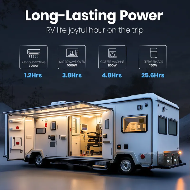 Key Features Automatic Self-Heating + Cooling Fan activates heating below 41°F (5°C) for -4°F charging and fan for active cooling above 104°F during high discharge — ultimate thermal control. 300A Continuous / 600A Peak BMS supports up to 3840W loads — run multiple high-draw appliances without throttling. Bluetooth 5.0 Smart Monitoring real-time app access to SOC, voltage, current, temperature, and fan status. 3840Wh Usable Capacity powers demanding RV systems for extended boondocking. Only 66 lbs — 1/3 the weight of equivalent lead-acid for effortless installation. 5000+ Cycles at 80% DOD with automotive-grade prismatic cells. IP67 Waterproof & Dustproof SPCC case for extreme environments. Wide Operating Range: discharge -4°F to 149°F, charge -4°F to 122°F (self-heating), storage -4°F to 149°F. Fully Scalable up to 4S4P (61.44kWh total) and drop-in compatible. Safe & Certified UL-listed cells, UN38.3, FCC, CE, RoHS, 5-year warranty.