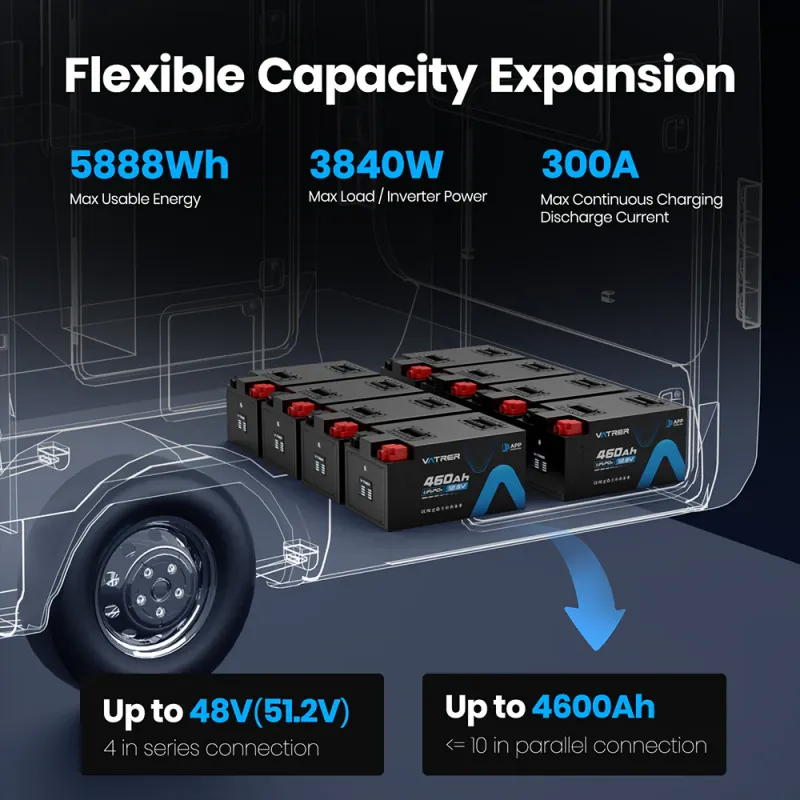 Key Features 300A Continuous / 600A Peak BMS – supports up to 3840W continuous load with zero voltage sag. Bluetooth 5.0 Real-Time Monitoring – SOC, voltage, current, temperature, and health via phone app. 5888Wh Usable Capacity – run a full-size RV for days on a single charge. Only 104.7 lbs – lighter than most 300–400Ah lead-acid banks. 5000+ Cycles at 80% DOD (10,000+ at 60% DOD) with automotive-grade cells. IP67 Waterproof & Dustproof SPCC steel case built for extreme environments. Wide Operating Range – discharge -4°F to 140°F, charge 32°F to 122°F. Fully Scalable – up to 4S4P (94.2kWh total) and drop-in compatible with all major 12V inverters/chargers. Safe & Certified – UL-listed cells, UN38.3, FCC, CE, RoHS, 5-year warranty.
