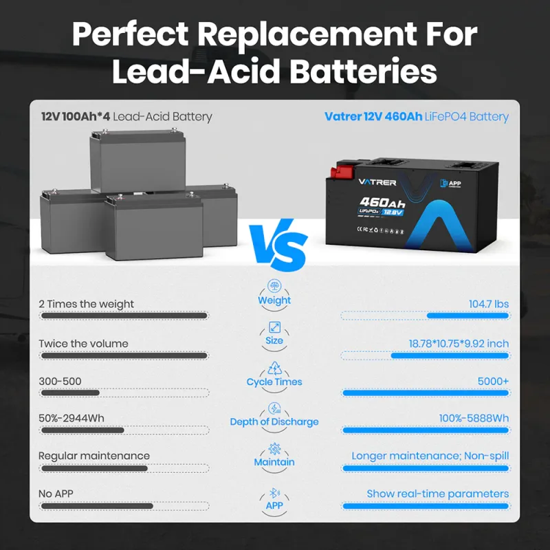 Vatrer 12V 460Ah LiFePO4 Bluetooth Deep Cycle Lithium Battery with 300A BMS – 5.888kWh RV & Solar Powerhouse