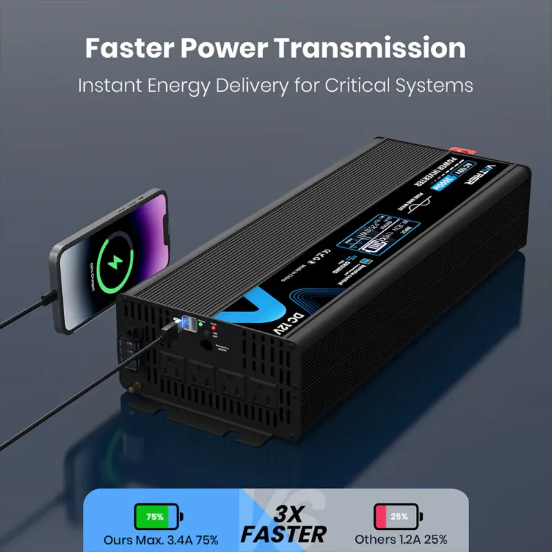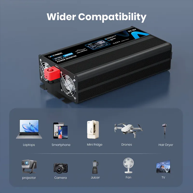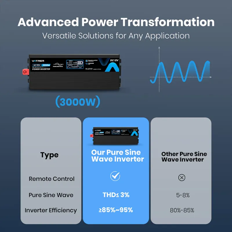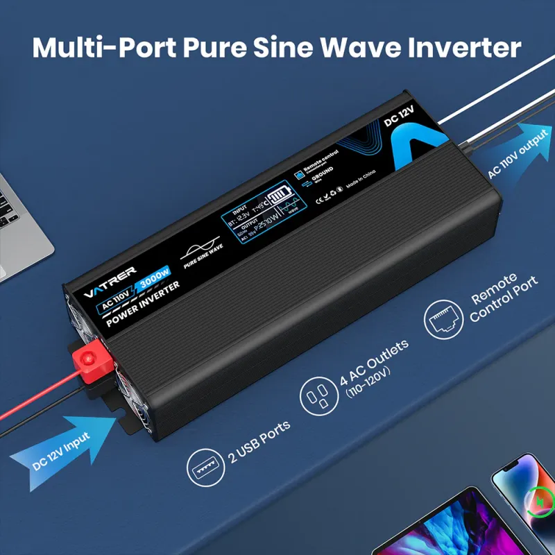 Convert your 12V DC battery power into stable 120V AC electricity with the Vatrer 3000W Pure Sine Wave Inverter (Model: 3000W Pure Sine Wave Inverter 12V to 120V) — the ultimate clean energy companion for demanding loads. Delivering 3000W continuous output (6000W surge) with ultra-low THD (<3%) for sensitive electronics like laptops, TVs, microwaves, and medical devices, this inverter ensures smooth, noise-free performance. Built-in protections and optional AC charger make it perfect for hybrid solar setups, RV camping, marine adventures, or emergency home backup.