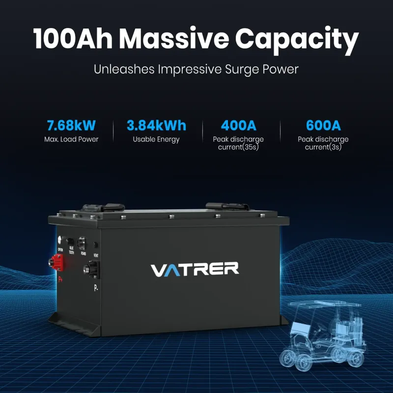 Go farther and faster with zero maintenance using the Vatrer 36V 100Ah Complete Lithium Conversion Kit – the perfect drop-in replacement for six 6V or eight 8V lead-acid batteries. Delivering 3.84 kWh of usable energy with a powerful 200A continuous / 600A peak BMS, this all-in-one kit includes the 38.4V 100Ah LiFePO4 battery, dedicated 43.8V 18A fast charger, Bluetooth SOC display, universal mounting tray, wiring harness, and hardware. Fits most 36V EZGO TXT/RXV, Club Car DS (pre-IQ), Yamaha G29/Drive, and similar carts – no rewiring needed.