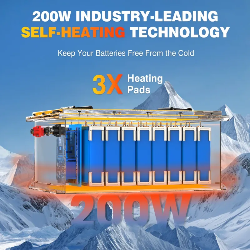 Specifications at a Glance Nominal Voltage: 51.2V • Capacity: 105Ah • Energy: 5376Wh (5.376 kWh) • Continuous Discharge: 200A • Peak Discharge: 400A (10s) • Max Charge Current: 100A • Heating Activation: <41°F (5°C) • Charge Temp with Heating: -4°F to 122°F • Efficiency: >99% • Self-Discharge: <3% per month • Dimensions: 31.1 × 13.4 × 10.2 in • Weight: 92 lbs • Terminals: Anderson SB175 or M8 • Enclosure: IP67 ABS/steel • Certifications: UL1973 (cells), UN38.3, FCC, CE • Warranty: 5 years