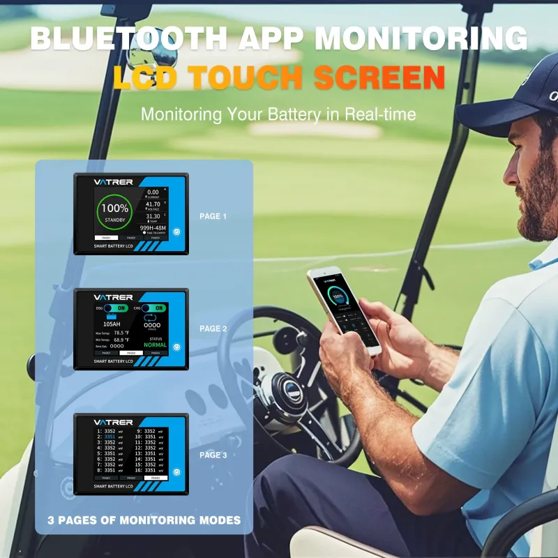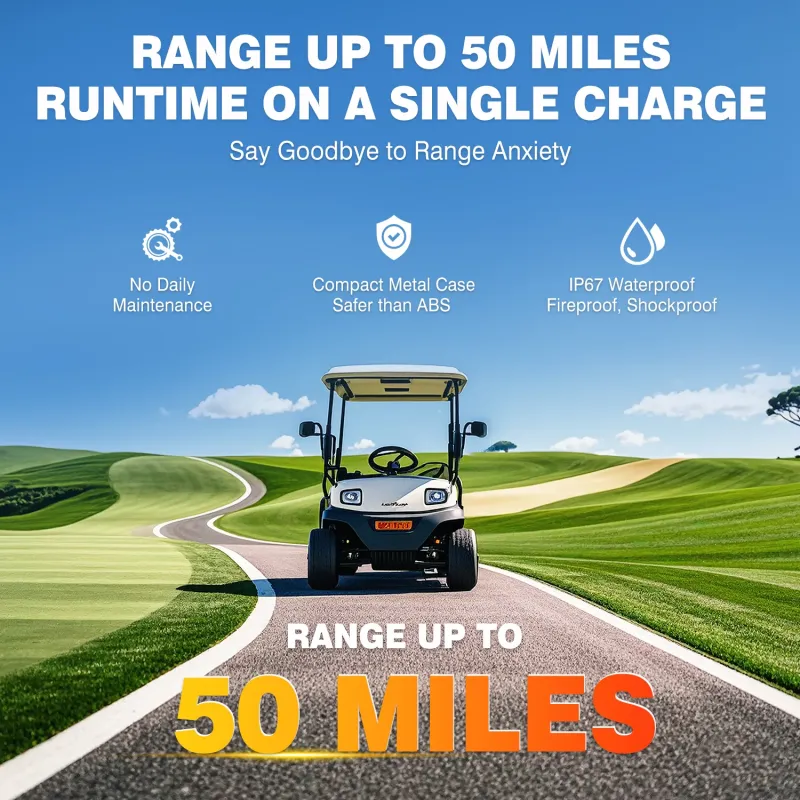 Key Features Automatic Self-Heating turns on below 41°F — charges down to -4°F (-20°C) in winter garages or cold courses. 200A Continuous / 400A Peak BMS – full power for acceleration and hills even in cold weather. Bluetooth 5.0 + LED SOC real-time monitoring on your phone or built-in display. 5.376 kWh Usable Energy – 45–70 mile range (terrain dependent). Only 92 lbs – drops 250+ lbs vs lead-acid for better speed and handling. 6000+ Cycles at 80% DOD – lasts 8–10× longer than lead-acid. IP67 Fully Waterproof & Shockproof – built for snow, rain, and rough courses. Universal Drop-In Fit for Club Car, EZGO, Yamaha, ICON & most 48V carts. Fast Charging – full recharge in ~5–6 hours with standard 58.4V charger. Safe & Certified – UL-listed cells, 5-year warranty.