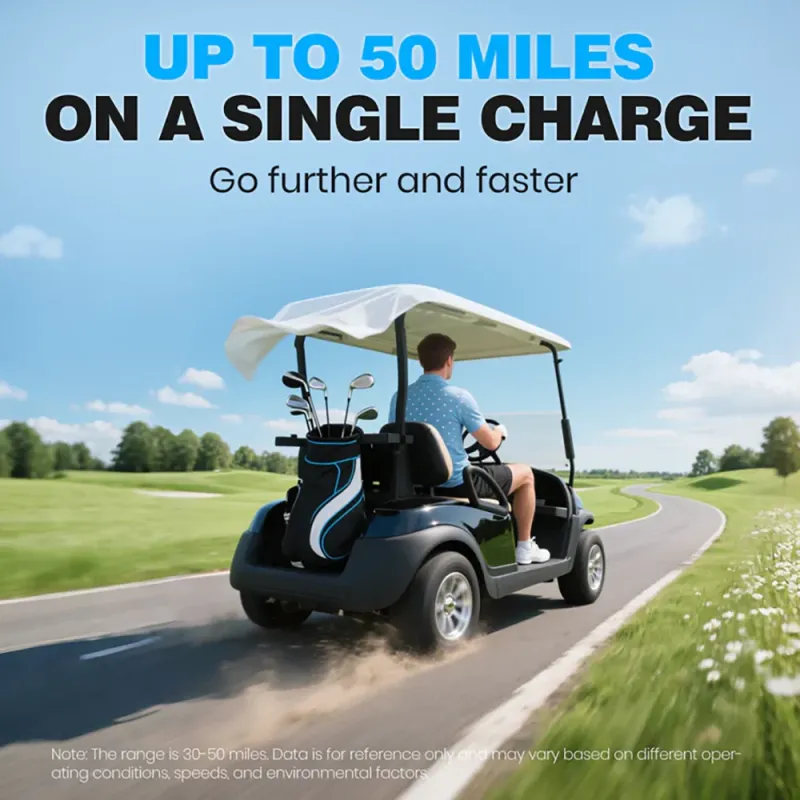 Key Features World’s Smallest 105Ah 48V Lithium – only 15.35 × 11.02 × 10.24 in (390 × 280 × 260 mm) — fits in spaces other batteries can’t. 200A Continuous / 400A Peak BMS – massive power for acceleration and heavy loads. Bluetooth 5.0 + LED SOC real-time monitoring on your phone or via built-in display. 5.376 kWh Usable Energy – 40–60 mile range on golf carts (terrain dependent). Only 77 lbs – drops 150–200 lbs vs lead-acid for better speed and handling. 6000+ Cycles at 80% DOD – 8–10× longer life than lead-acid. IP67 Fully Sealed – waterproof, dustproof, vibration-proof for commercial & outdoor use. Cold-Weather Ready – discharge down to -4°F with low-temp protection. Fast Charging – full recharge in ~5 hours with standard 58.4V charger. Safe & Certified – UL-listed cells, UN38.3, FCC, CE, 5-year warranty.