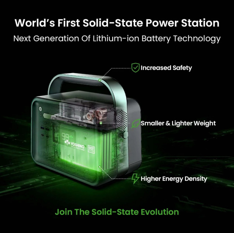 The Yoshino B330 SST is an ultra-compact, lightweight portable power station featuring advanced semi-solid state battery technology for enhanced safety, energy density, and longevity. This small but powerful unit provides reliable power for phones, laptops, lights, small fans, CPAP machines, and other essentials — ideal for camping, travel, hiking, or light emergency backup.
