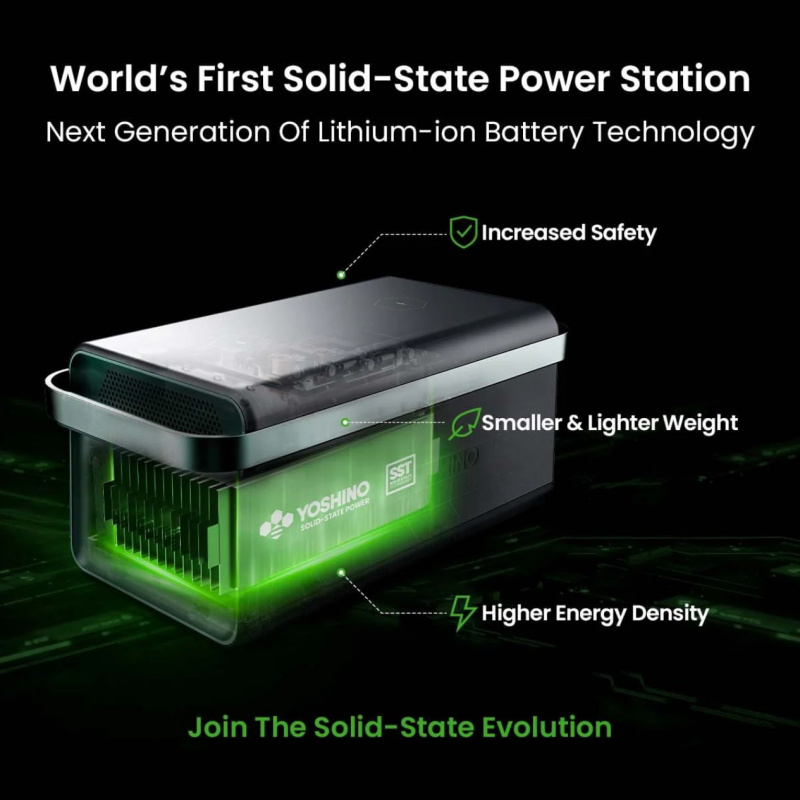 The Yoshino K40SP23 is a powerful, solid-state portable solar generator kit featuring a 3840Wh battery and three 200W foldable solar panels (600W total). Built with advanced solid-state Li-ion technology for enhanced safety and longevity, this complete system is ideal for whole-home backup, large RV setups, off-grid cabins, or emergency power.