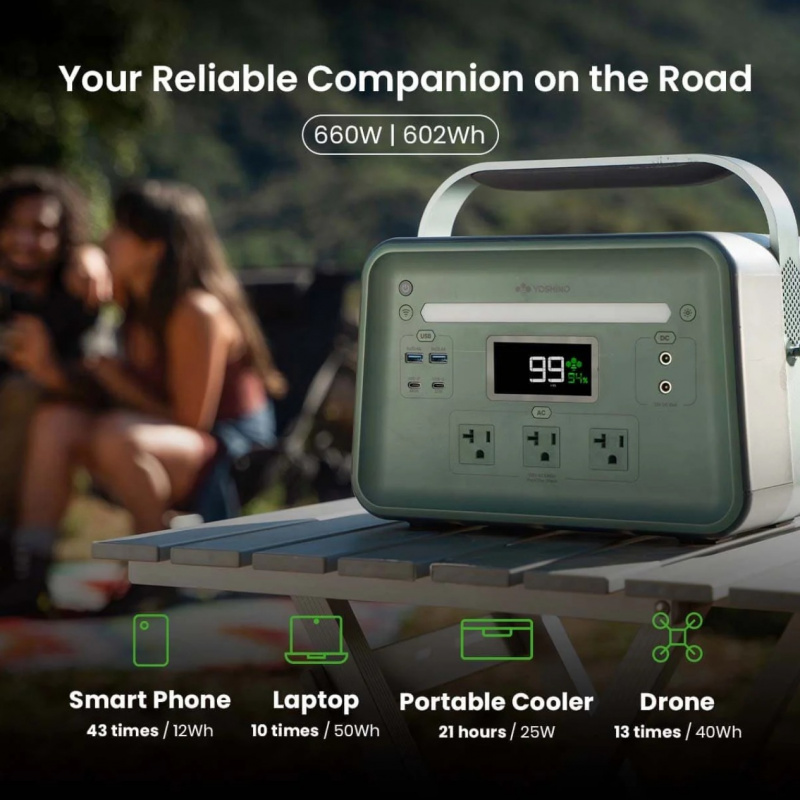 The Yoshino K6SP11 is a compact, solid-state solar generator kit combining a 600Wh power station with one 100W foldable solar panel. This lightweight bundle delivers safe, reliable power with renewable solar recharging — perfect for camping, RV trips, hiking, travel, or emergency backup.