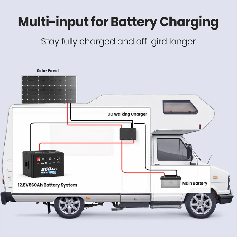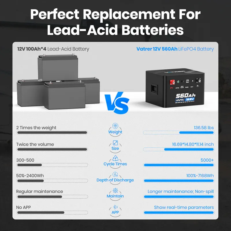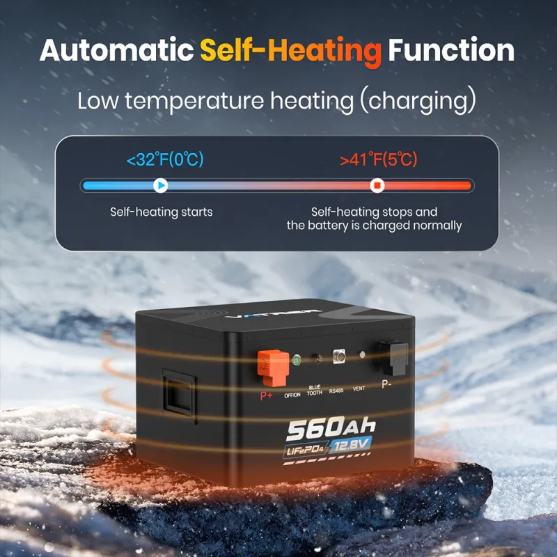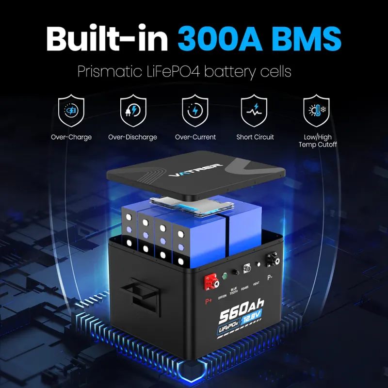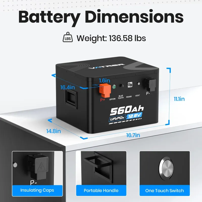 Unleash unrivaled power with the Vatrer 12V 560Ah self-heating flagship — the single largest 12V LiFePO4 battery on the market. Delivering a colossal 7168Wh (7.168kWh) of 100% usable energy with a brutal 300A continuous / 600A peak discharge, this beast runs multiple air conditioners, induction cooktops, microwaves, and inverters simultaneously — all while charging in freezing temperatures thanks to its intelligent self-heating system. Perfect for full-time RV boondocking, massive solar arrays, liveaboard marine house banks, and remote off-grid cabins.