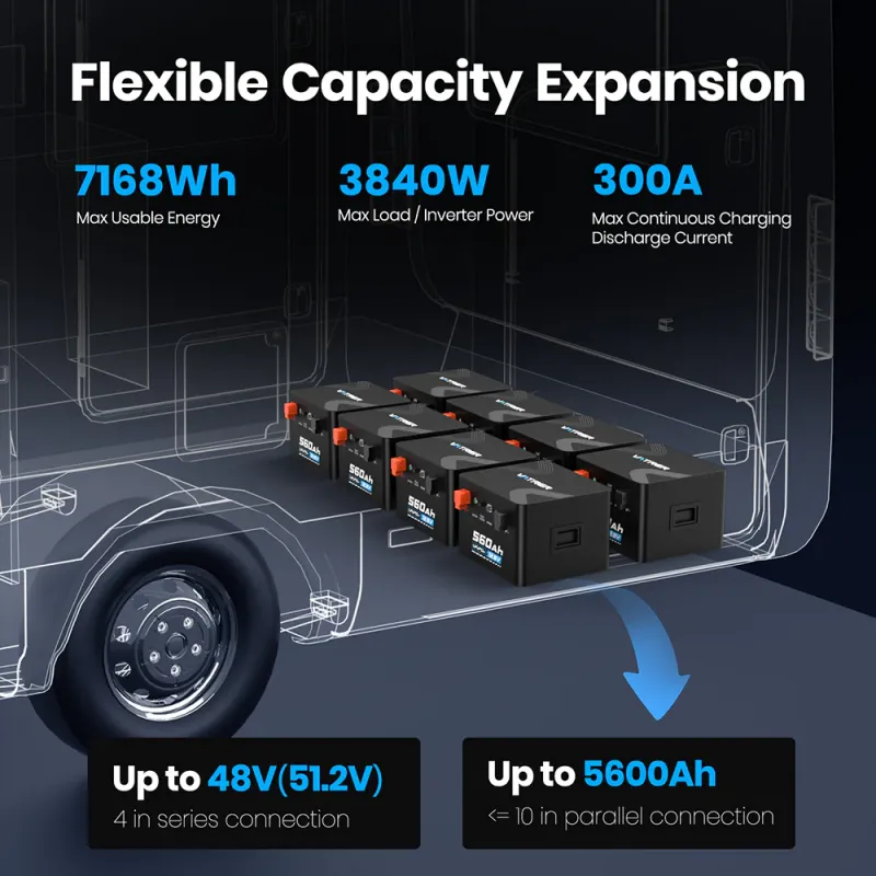 Key Features Automatic Self-Heating activates below 41°F (5°C) for true -4°F (-20°C) charging — winter-proof for year-round use. Insane 300A Continuous / 600A Peak BMS supports up to 3840W continuous load — no inverter too big. Bluetooth 5.0 + Touchscreen Display real-time SOC, voltage, current, temperature, and health monitoring. 7168Wh Usable Capacity powers a full-size RV for days without solar or shore power. Only 128 lbs — still lighter than most 400–500Ah lead-acid banks. 6000+ Cycles at 80% DOD with automotive-grade prismatic cells. IP67 Fully Waterproof & Dustproof SPCC steel case built for extreme environments. Fully Scalable up to 4S4P (114kWh total) and drop-in compatible with all major 12V systems. Safe & Certified UL1973 cells, UN38.3, FCC, CE, RoHS, 5-year warranty.